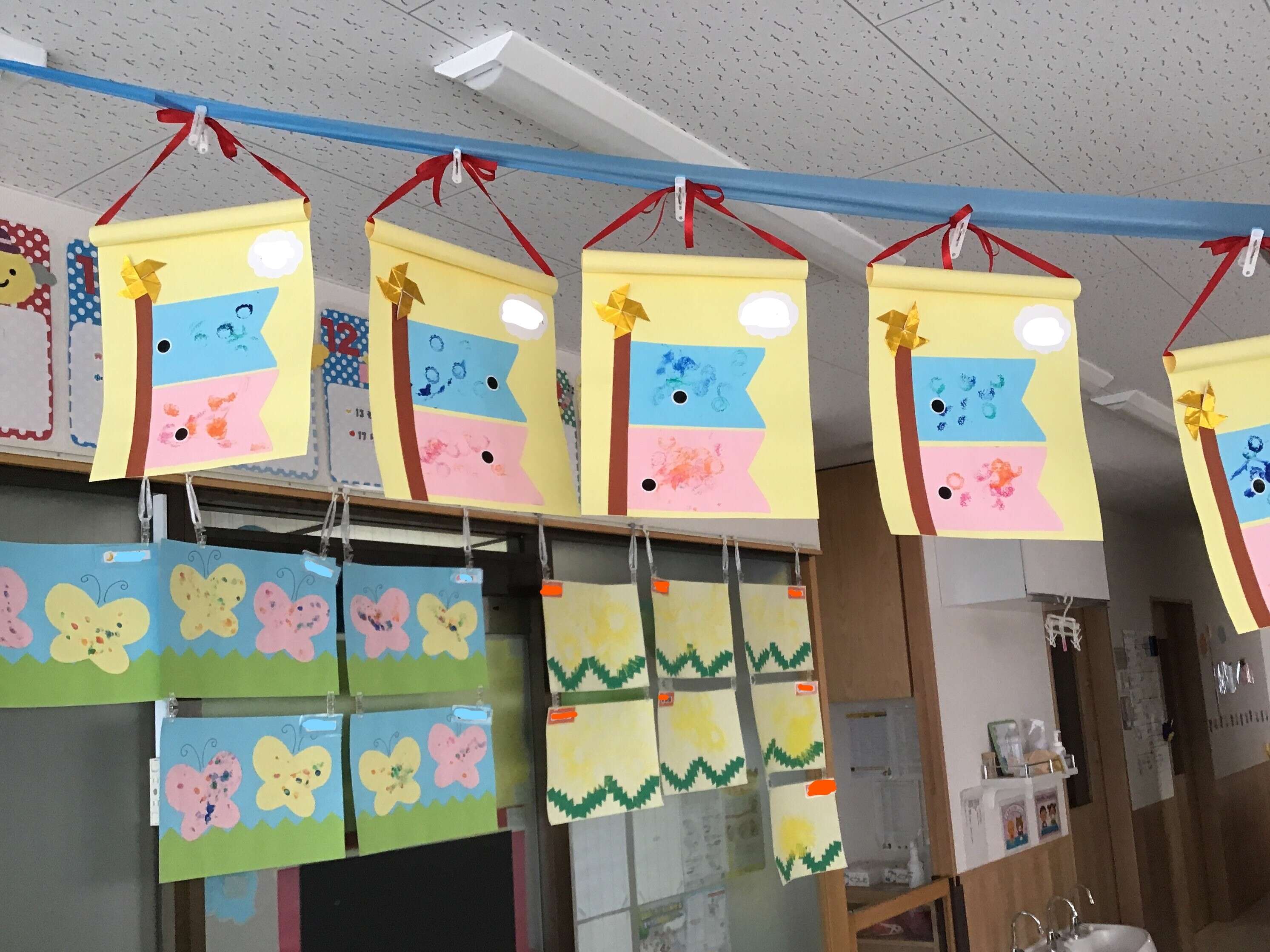 屋根より高いこいのぼりはなかなか見かける事が出来なくなりましたが、保育園にはみんなが作ってくれたこいのぼりが元気に泳いでいます!