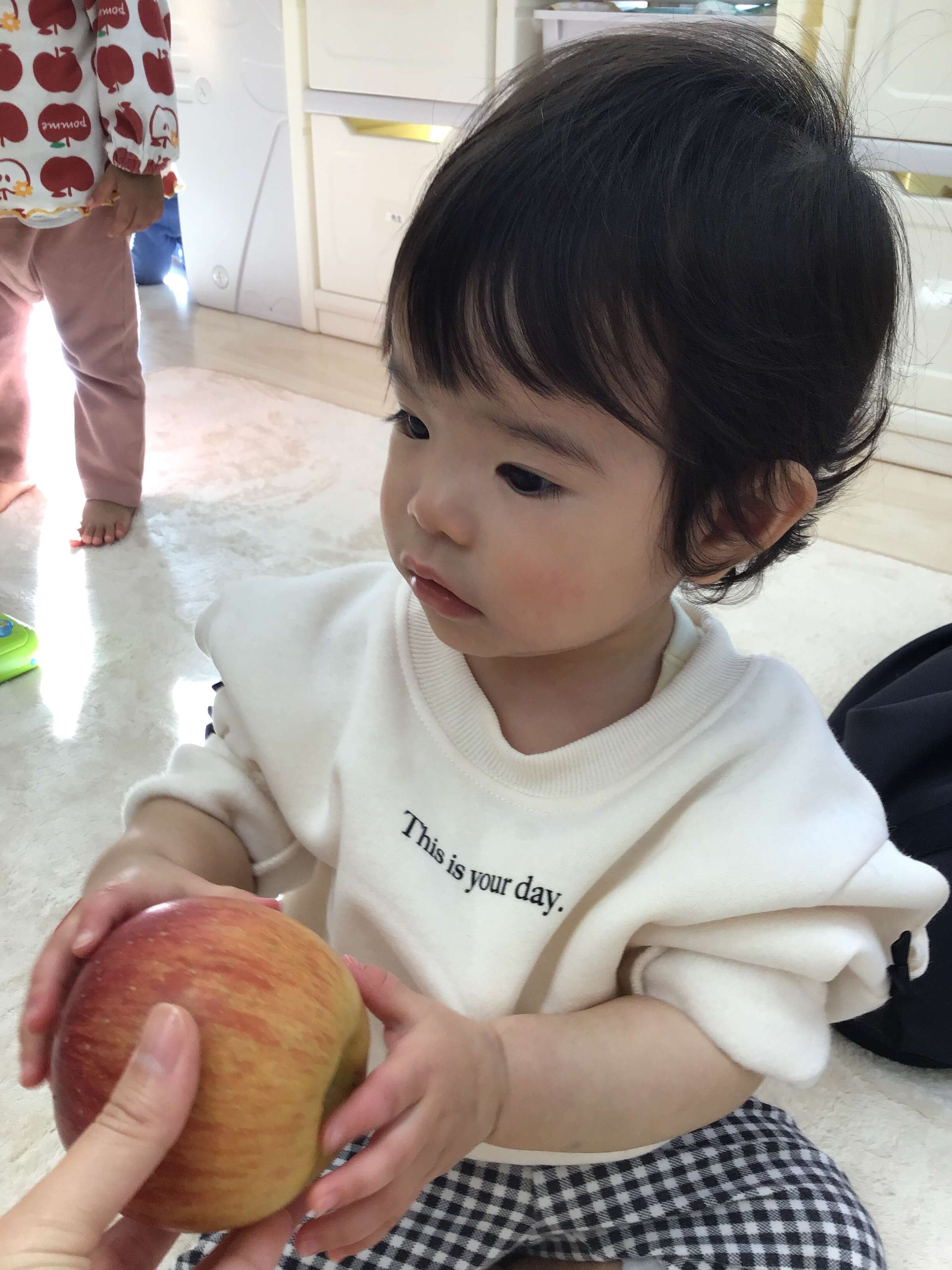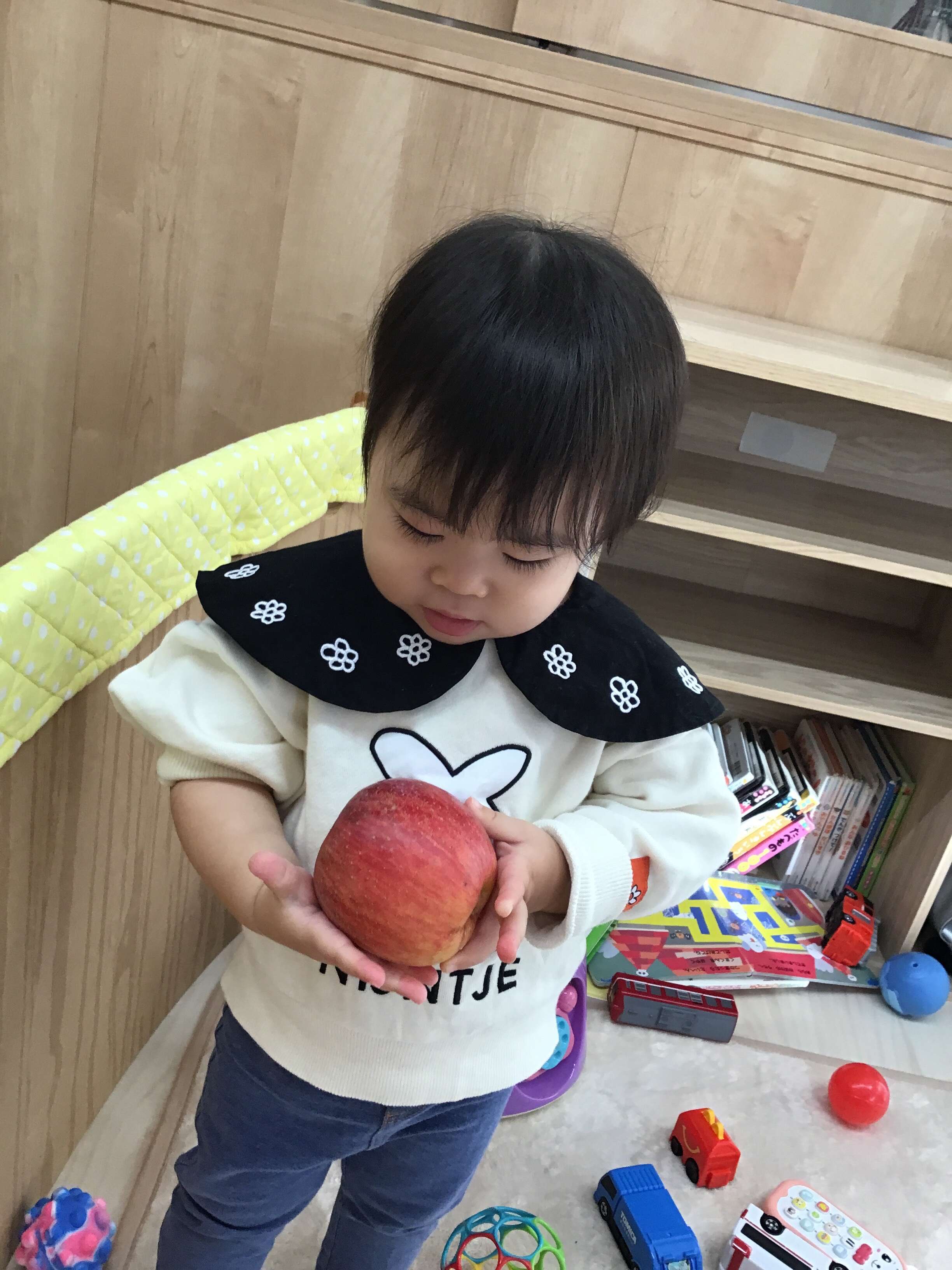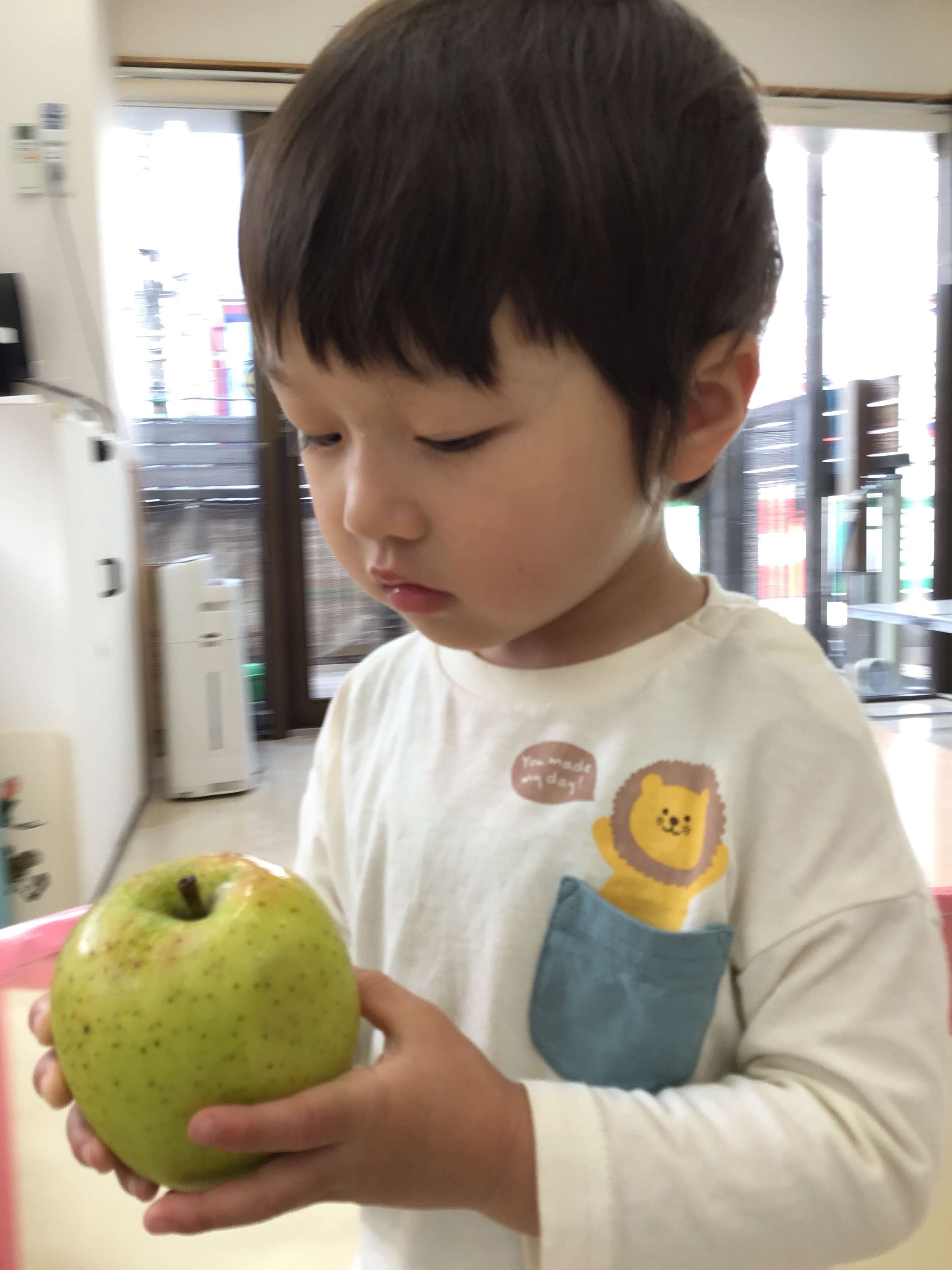 保育園でリンゴは食べられないけど(窒息防止のため)、手のひらいっぱい広げてにおいを嗅ぎました。